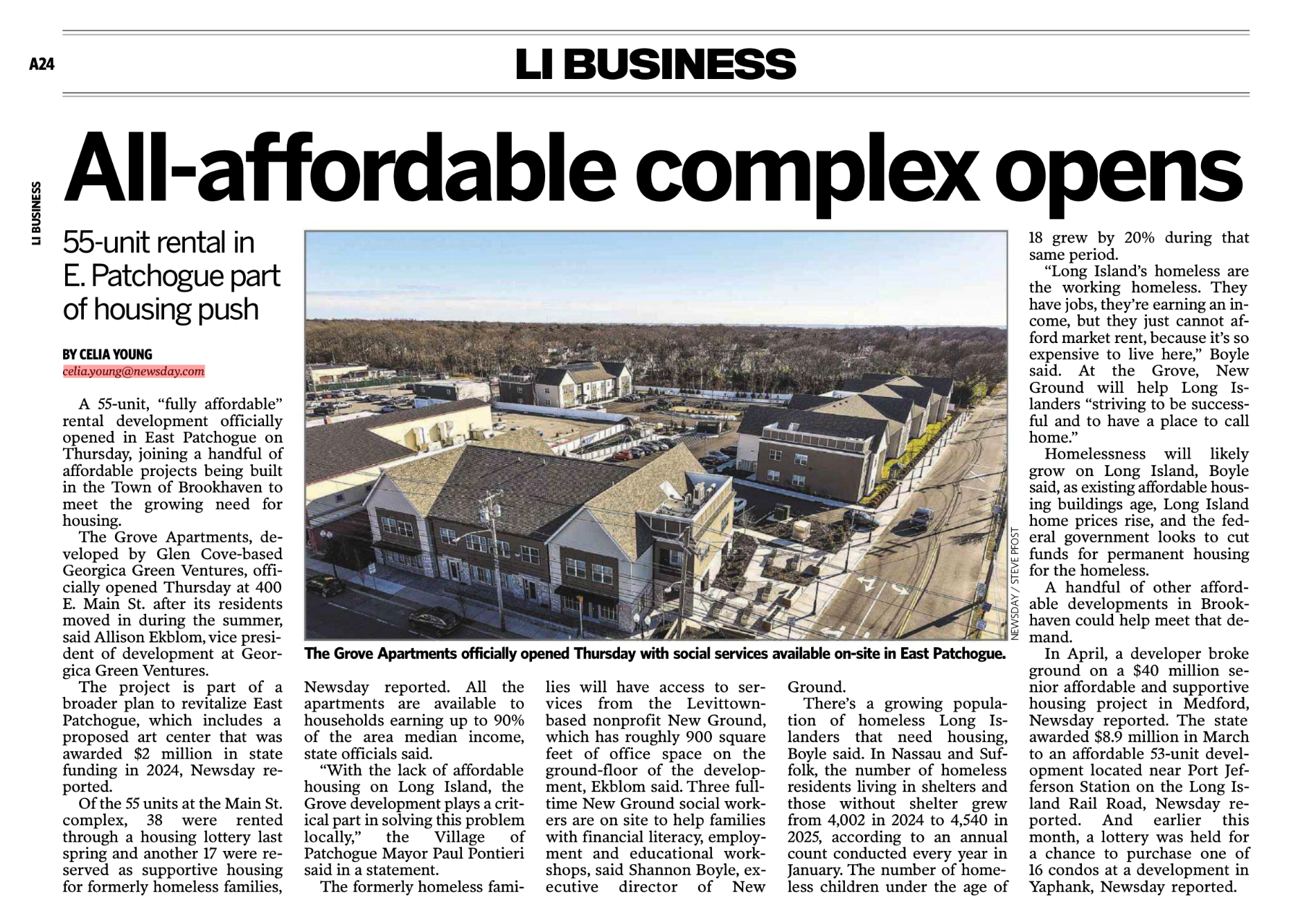 Newsday covers the latest on The Grove, an affordable apartment complex in East Patchogue developed by Georgica Green Ventures with The Kulka Group.