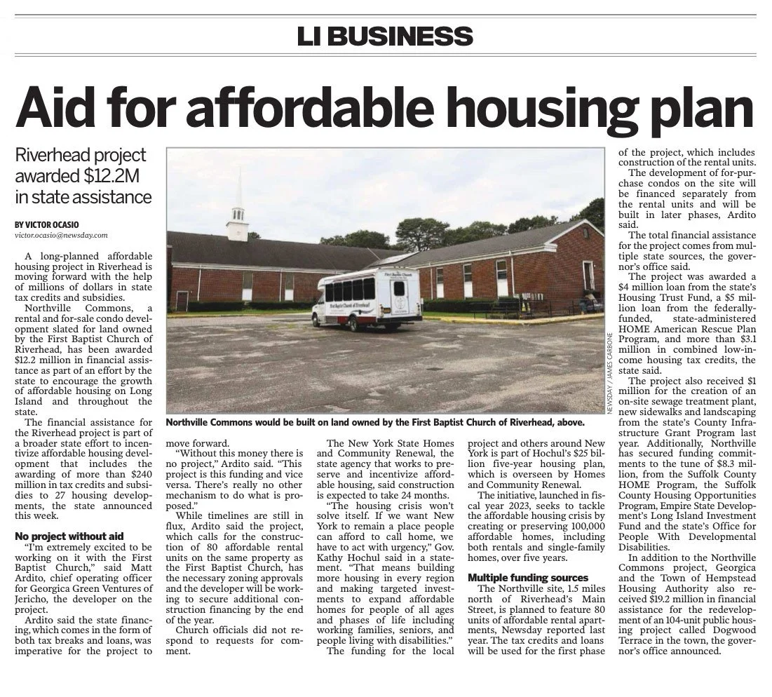 Northville Commons, a collaboration between the First Baptist Church of Riverhead and Georgica Green Ventures received $12.2 Million in funding from New York State Homes and Community Renewal. Victor Ocasio reports for Newsday about this latest funding.